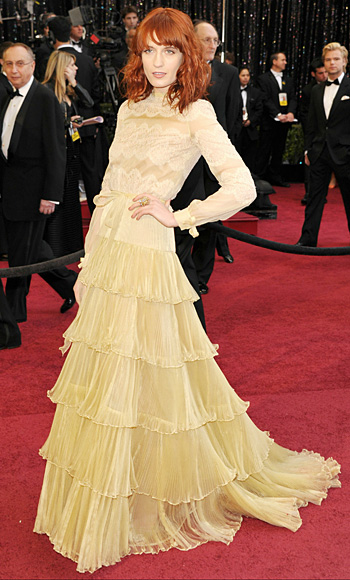 The risk-takers continue with Nicole Kidman‘s Asian-inspired gown which was also ill-fitting. I wanted to see her in something fabulous like the tiered gown she wore at this year’s Grammys, but was left wondering if she was trying to recall the neon green Dior creation from back in 1997. Sharon Stone finally made a glamorous comeback after several flops, but our favorite songbird it-girl Florence Welch looked better during her on-stage performance than in this Valentino dress that looked like her swan-adorned Grammy gown.
