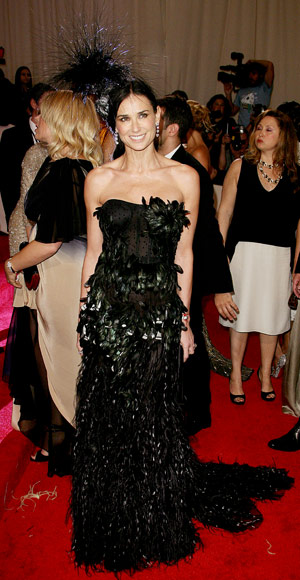 Demi Moore in a black Prabal Gurung gown with a Philip TReacy hat, rings by Cartier & shoes by Casadei