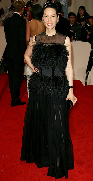 Lucy Liu in a feather & sheer Vionnet gown with Lorraine Schwartz jewelry & Sergio Rossi pumps