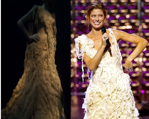 As soon as I saw this dress (sorry it’s blurry), I had to do some serious style thinking & eventually remembered that Debra Messing wore it to the 2002 VH1 Vogue Fashion Awards. She caused quite a stir, but helped make the fashion world see that McQueen’s designs were daring works of art.