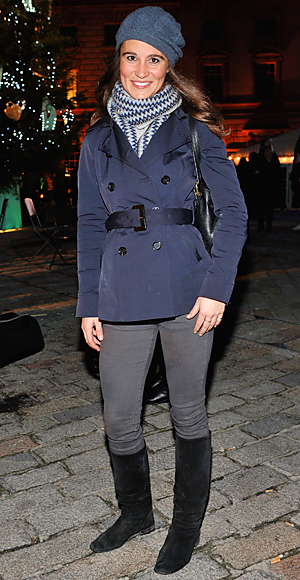Pippa Middleton in a belted jacket, gray skinny jeans, suede black knee boots, & chunky knit scarf