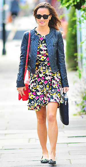 Pippa Middleton in a printed French Connection dress with her leather Whistles jacket & black flats