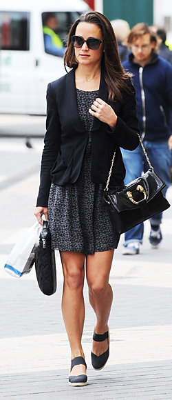 Pippa Middleton in a Whistles printed dress with a black blazer & espadrilles