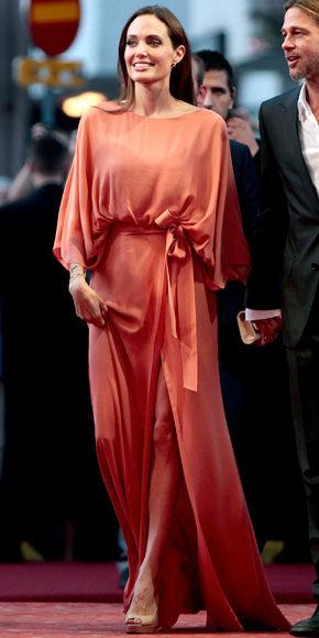 Angelina Jolie in a coral Elie Saab dress with Jimmy Choo peep toes