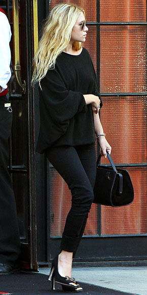 Ashley Olsen in a black top & skinny pants with bowed heels & a bag from The Row