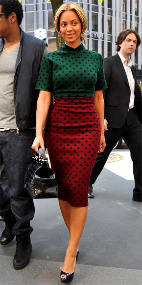 Beyonce Knowles in a color-block polka dot dress by Marc Jacobs with peep toe Louboutins