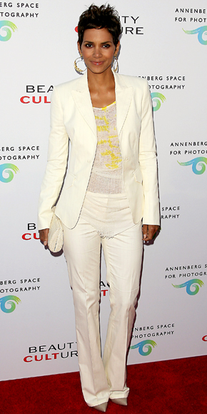Halle Berry in a white Roberto Cavalli suit with Bavna earrings & a clutch by Kelly Locke