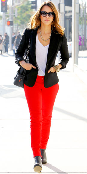 Jessica Alba in Kate Spade New York jeans with a white tee, black jacket, Giles & Brother necklace, Lizzy Couture bangles, & leather booties