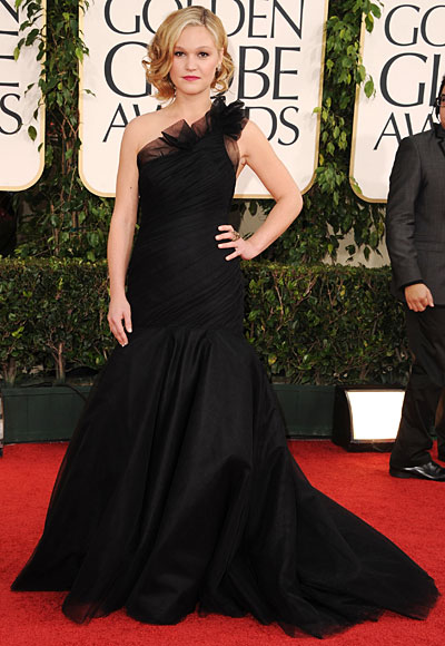 Julia Stiles in a black tulle Romona Keveza gown with H. Stern jewelry