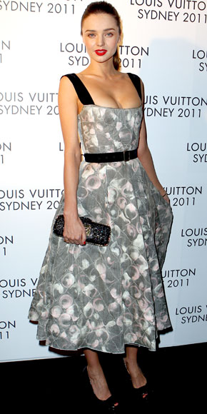 Miranda Kerr in a Louis Vuitton printed dress with a jeweled clutch & peep toe heels