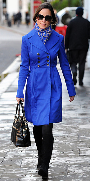 Pippa Middleton in a royal bluse double-breasted coat with a Beulah London scarf, knee-high Russell & Bromley boots & a black Modalu tote