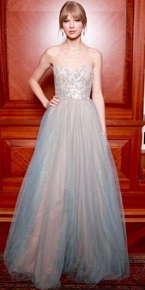 Taylor Swift in a leaf bodice Reem Acra gown with House of Lavande jewelry