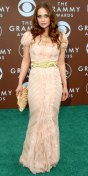 Fergie in a pale yellow strapless gown by Calvin Klein Collection at the 2008 Grammys Gwen Stefani in an animal printed L.A.M.B. one-shoulder gown at the 2006 Grammys