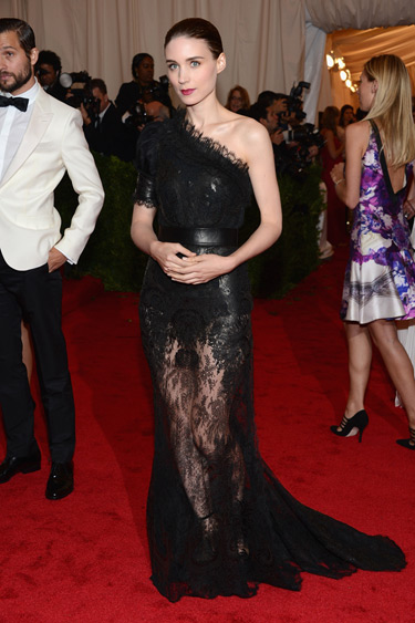 Rooney Mara in a black lace one shoulder gown by Givenchy by Riccardo Tisci