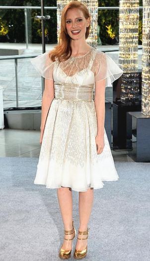 Jessica Chastain in a Prabal Gurung cocktail dress with jewelry by Harry Winston