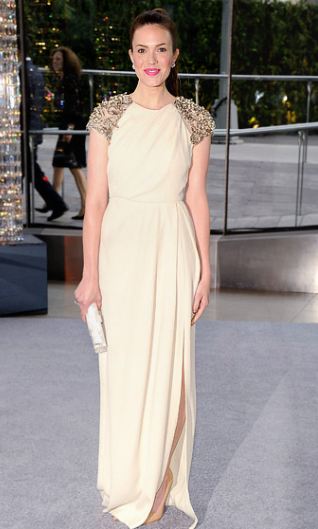 Mandy Moore in an ivory Lela Rose gown with an Edie Parker clutch, nude Prada shoes, & jewelry by Adler, Misaki, & Norman Silverman