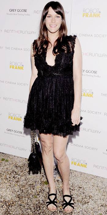 Liv Tyler in a plunging v-neck babydoll dress with black strappy sandal flats.