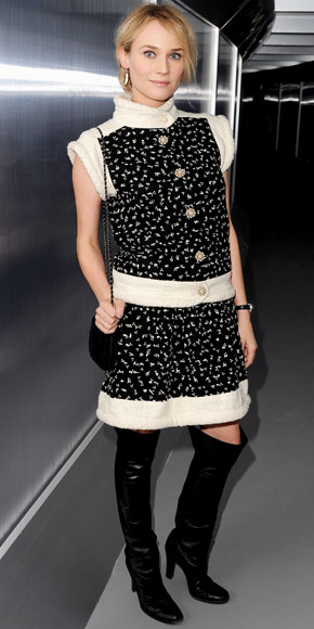 Diane Kruger in a Chanel’s boucle shift dress with a quilted chainstrap bag & thigh-high boots.