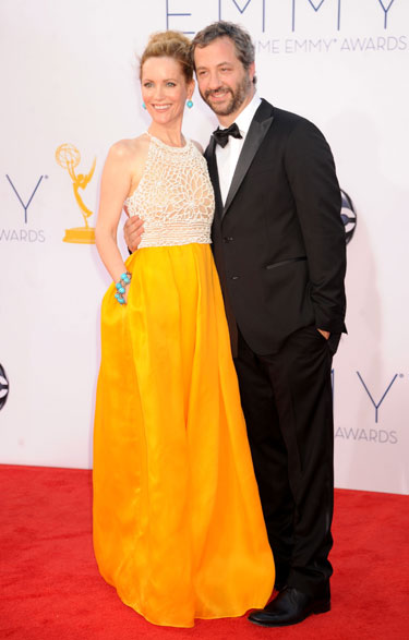 Leslie Mann in a yellow & cream Naeem Kham gown with Judd Apatow.