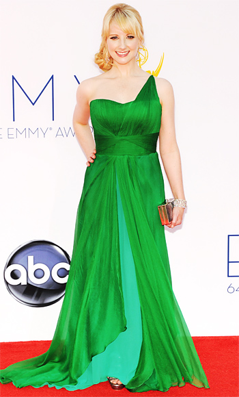 Melissa Rauch in a one-shoulder multi color Oliver Tolentino gown with a Rebecca Minkoff minaudiere.