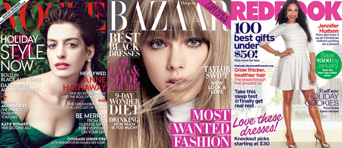 Anne Hathway for Vogue, Taylor Swift for Harper’s Bazaar, & Jennifer Hudson for Redbook December 2012