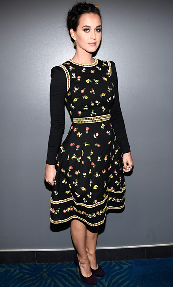 Katy Perry in a flower printed Valentino dress with Jimmy Choo shoes, a Jennifer Behr headpiece, & earrings by Sylvia & Cie.