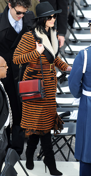 Katy Perry in a striped orange & black coat with a fur collar & Christian Louboutin purse