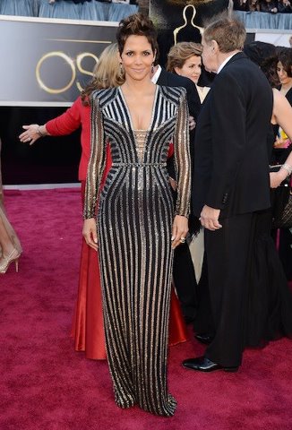 Halle Berry in a silver & black striped Versace long-sleeved gown