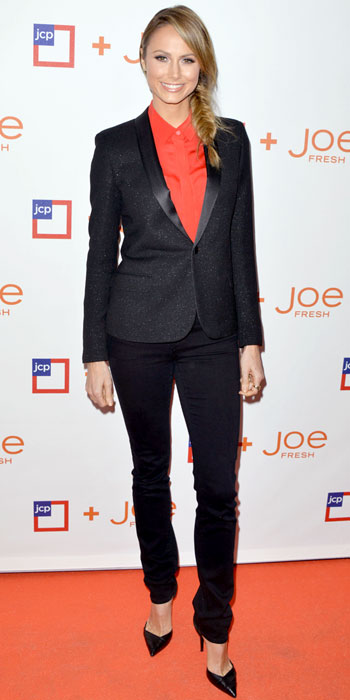 Stacy Keibler in a crimson blouse with a slim-leg black suit & pointy toe pumps.