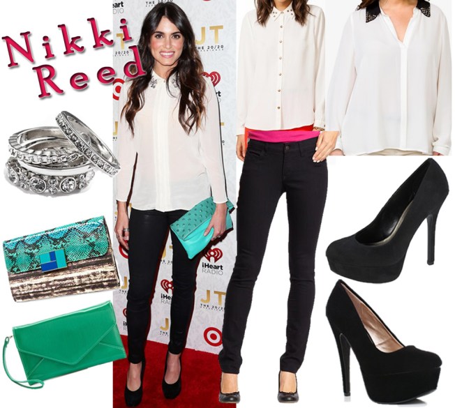 This week, actress Nikki Reed, of The Twilight Saga fame, hit up Justin Timberlake‘s Target-sponsored release party for his latest album, The 20 / 20 Experience, in a long-sleeved white blouse with stud embellishments on the collar, curve-hugging black skinny pants, towering platforms, & added a bright pop of color with a turquoise clutch. Her look is hitting all the right notes here & I love the simplicity in her menswear-inspired outfit with some trendy touches that any Style Darling can pull off. The prove my point, I went seraching for similar items to complete an affordable outfit that a woman of any size can sport.