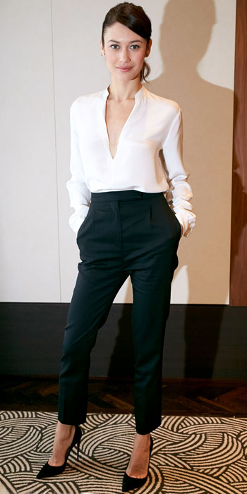 Olga Kurylenko in a plunging white blouse with slim black pants & black pointy toe stilettos.