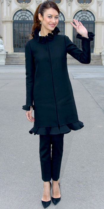Olga Kurylenko in black skinny pants & black ruffled jacket in Vienna.