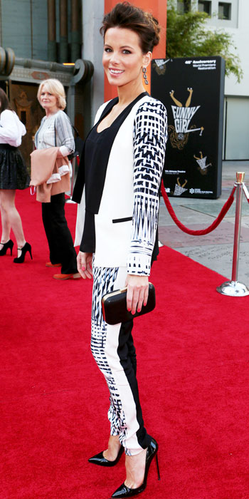 Kate Beckinsale in a black & white patterned suit with a matching Me Char clutch & patent pumps.