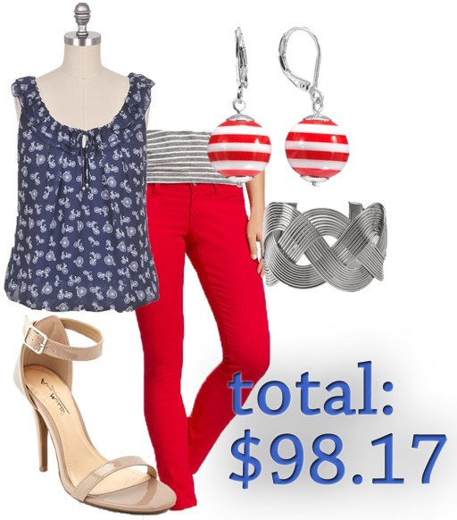 Accessories that make for perfect finishing touches to this look include the ankle-strap single sole pump ($25.50) in nude from Charlotte Russe, the Croft & Barrow silver tone striped bead drop earrings ($5.40) in red white from Kohl’s, & Forever 21‘s multi strand woven cuff ($4.80). This whole look has a nautical feel to it, not to mention the Americana color combination that’s sure to liven & brighten up the season. I really love how each piece can be mixed & matched with other wardrobe essentials, as well as reinvented with pieces like the blouse with a hot pink pencil skirt, the jeans for a sequined tank, or the shoes with an embellished sheath dress.