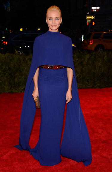 Cameron Diaz in a royal blue cape gown by Stella McCartney with a gold spiked belt & metallic minaudiere
