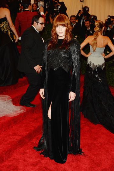 Florence Welch in a black velvet fringed gown by Givenchy by Riccardo Tisci