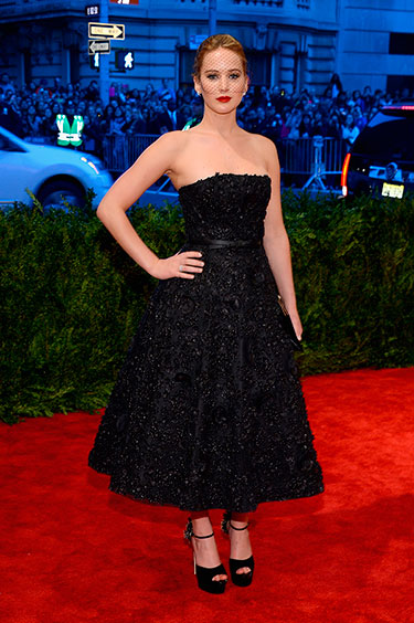 Jennifer Lawrence in a black strapless tea-length design by Christian Dior with ankle strap platforms sandals.