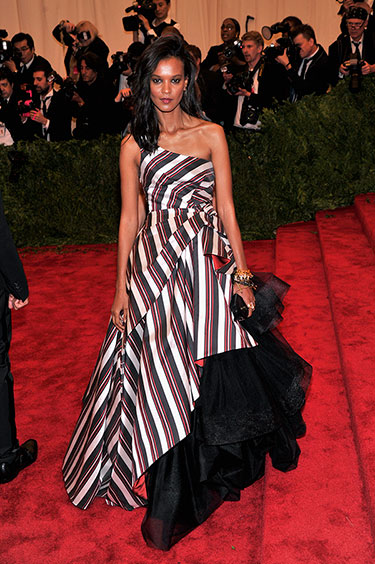 Liya Kebede in a striped one-shoulder Alberta Ferretti gown