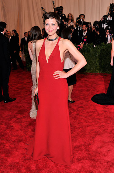 Maggie Gylenhaal in a red deep-v Calvin Klein dess