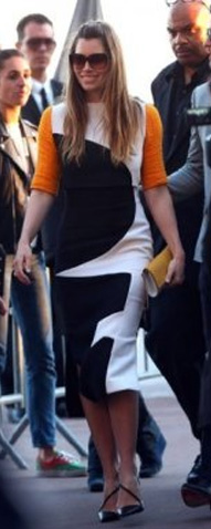 Jessica Biel in a colorblocked Roksanda Ilincic sheath dress.