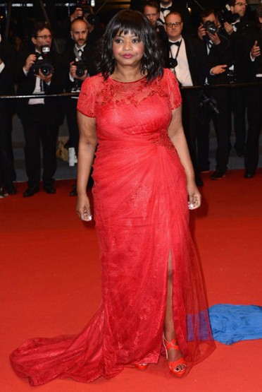 Octavia Spencer in a red lace Tadashi Shoji slitted dress.