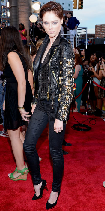 Coco Rocha in an embellished leather Fausto Puglisi jacket with black skinny jeans & pumps.
