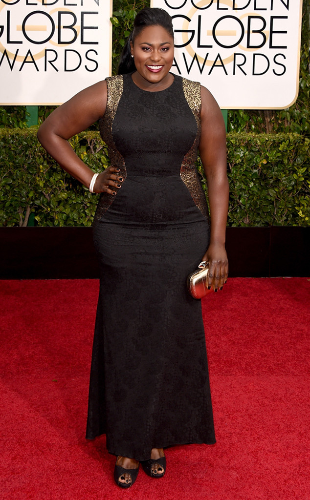 Danielle Brooks in a black brocade & gold sleeveless gown.