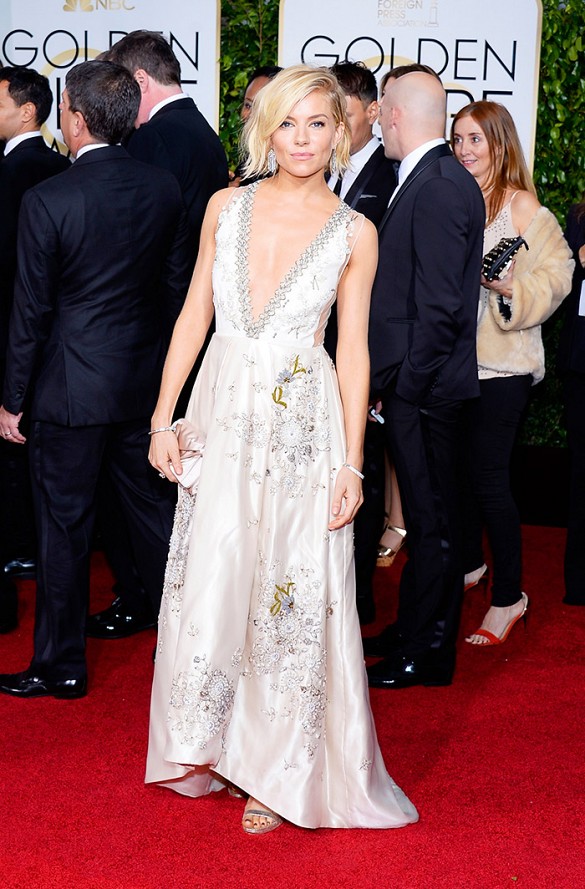 Sienna Miller in a ivory silk duchesse gown by Miu Miu with jewelry by Tiffany & Co. & Jimmy Choo sandals.