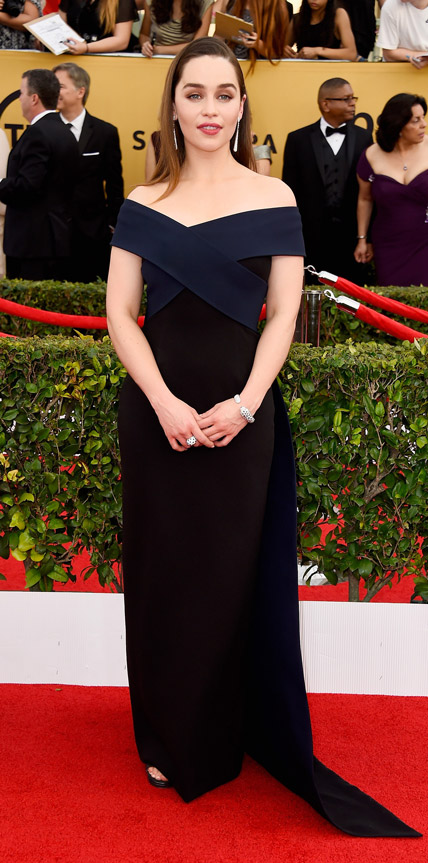 Emilia Clarke in a midnight & black Donna Karan Atelier criss cross gown with jewelry by Cartier.