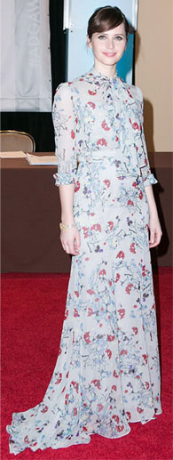 Felicity Jones in a floral print neck-tie silk gown by Erdem at the 19th Annual Art Directors Guild Excellence in Production Design Awards.
