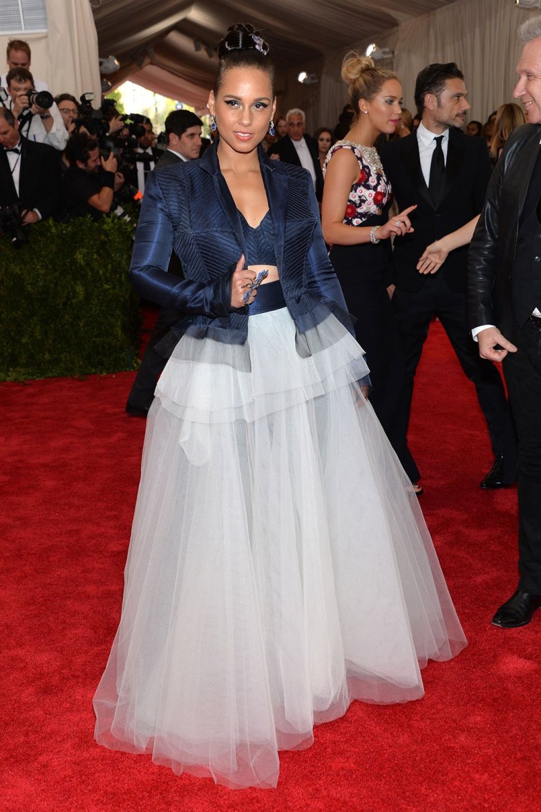Alicia Keys in a Jean Paul Gaultier chiffon jacket & ballgown design at the 2015 Met Gala. 01.