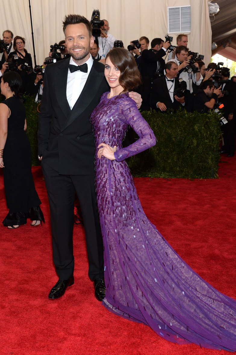 Alison Brie in a purple long sleeved beaded & sequin gown by Prabal Gurung & Joel McHale at the 2015 Met Gala. 01.
