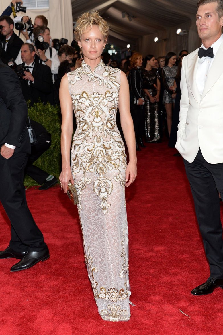 Amber Valetta in a lace white & gold column dress by Alberta Ferretti at the 2015 Met Gala. 01.