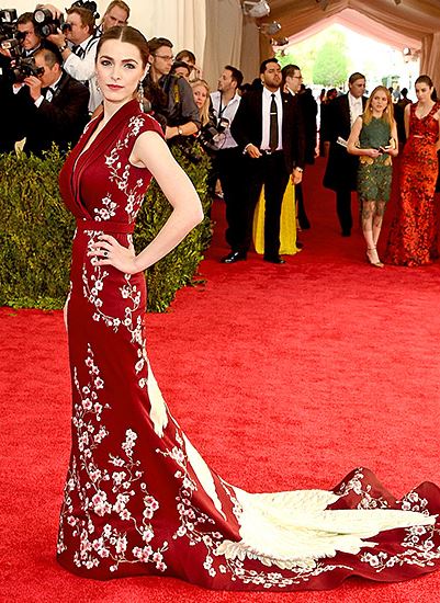 Bee Shaffer in a burgundy & Cream custom Alexander McQueen dress at the 2015 Met Gala. 01.